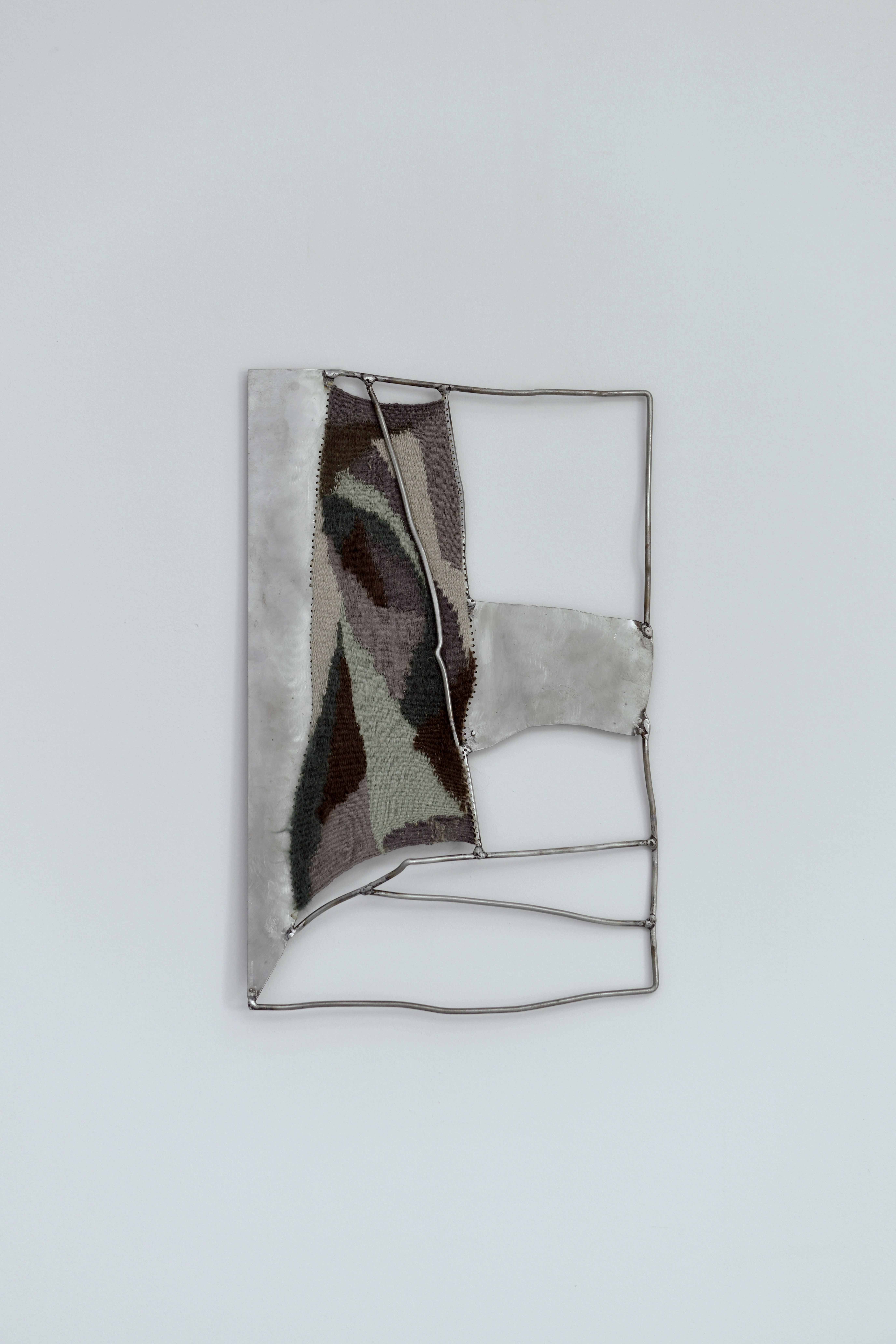 Métal tissé n°1, 2023, soudure à l'arc et tissage à l'aiguille, tôle en acier et tiges en inox lin et laines animales, 50 x 33 cm